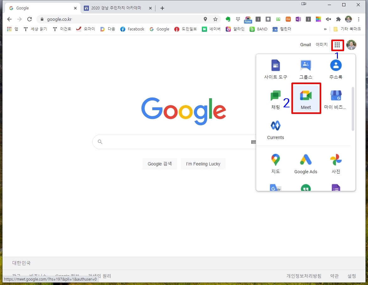 4)위 사진과 같이 구글 사이트(https://www.google.co.kr) 로 접속하면 타일 모양(1번)을 누르면 Meet가 보입니다. 여기까지 확인하신 분은 준비가 다 되신 겁니다. 위 사진은 크롬으로 접속한 화면입니다. (꼭 크롬으로 접속하시기 바랍니다.)