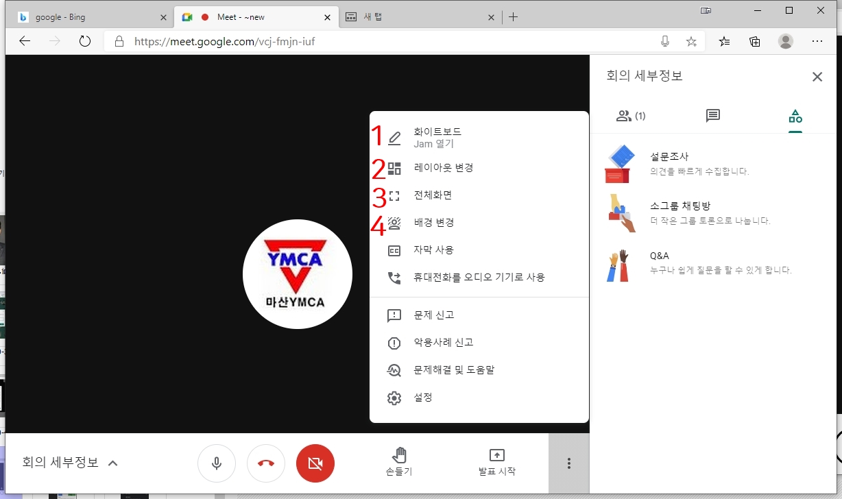 ▶ 구글 미트 기능(메뉴) 익히기 - 일찍 로그인 하신 분들은 아래 기능을 익히시면 됩니다.