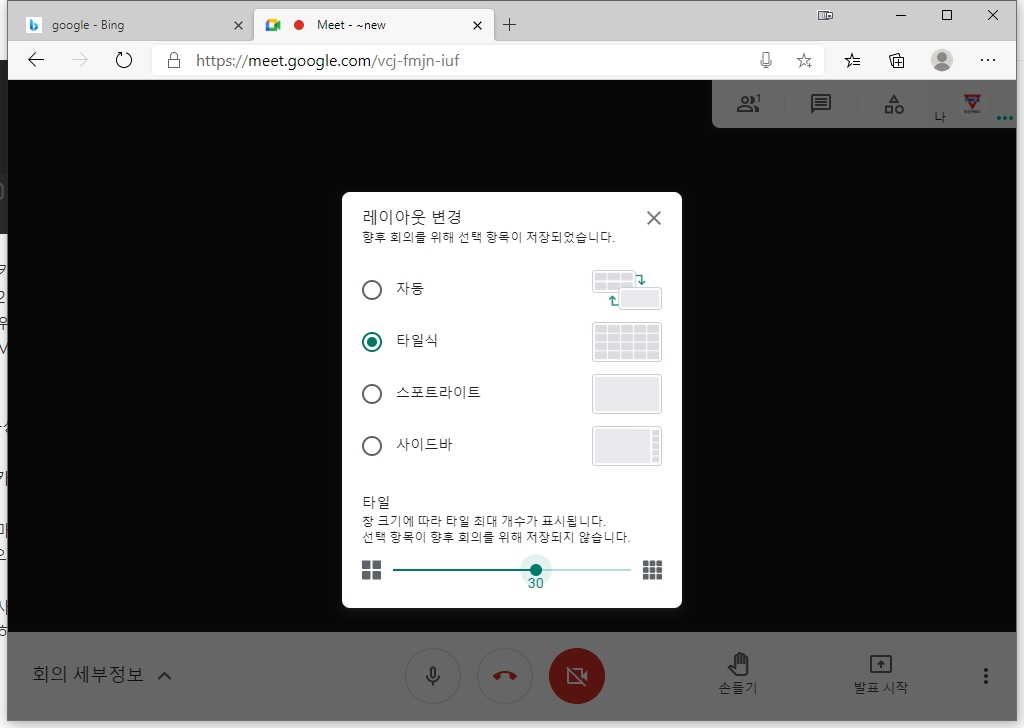 2) 레이아웃 변경 - 다양한 레이 아웃으로 변경할 수 있다. 타일식을 선택하고 맨 아랫 쪽 숫자를 조정하면 화면에 표시되는 참가자 숫자를 바꿀 수 있다. 최대 49명까지 표시할 수 있다.