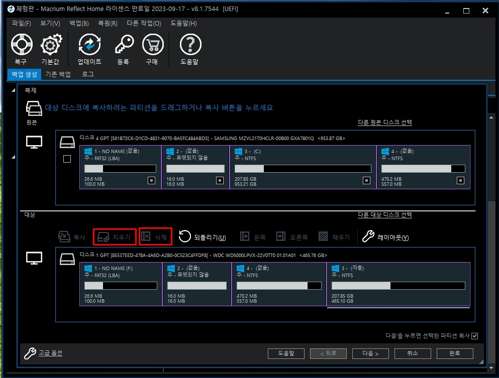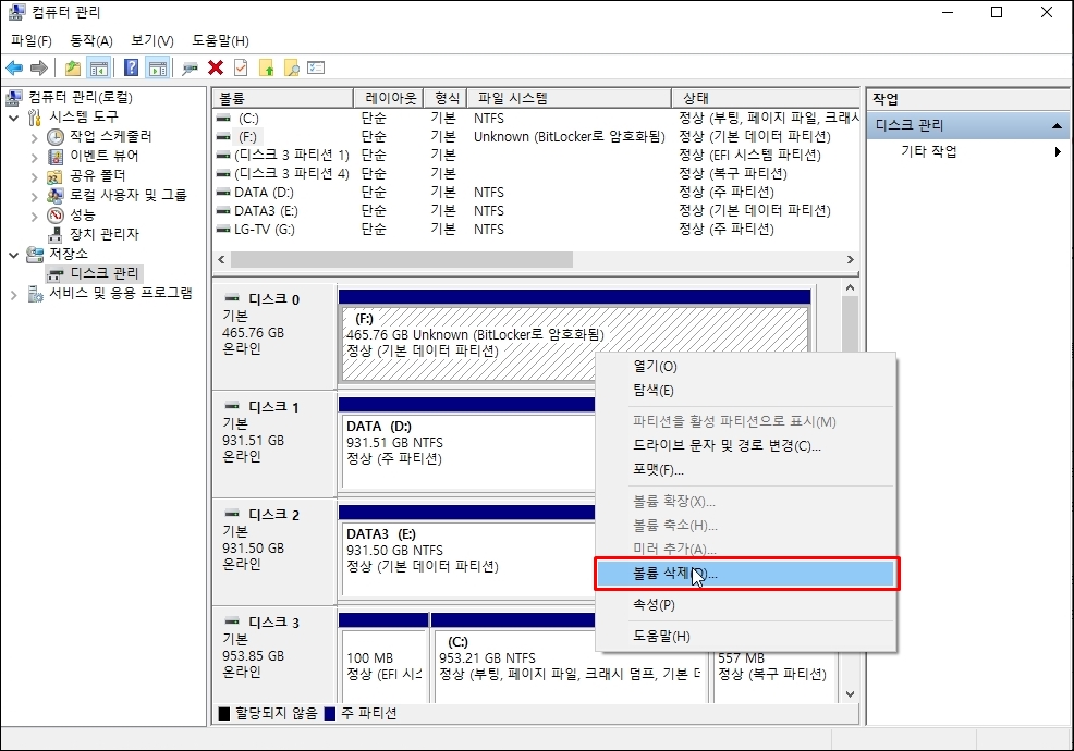 아래 사진에서 보는 것 처럼 대상 디스크의 파티션을 삭제하기, 지우기를 해도 1번 파티션이 삭제가 되지 않았습니다.